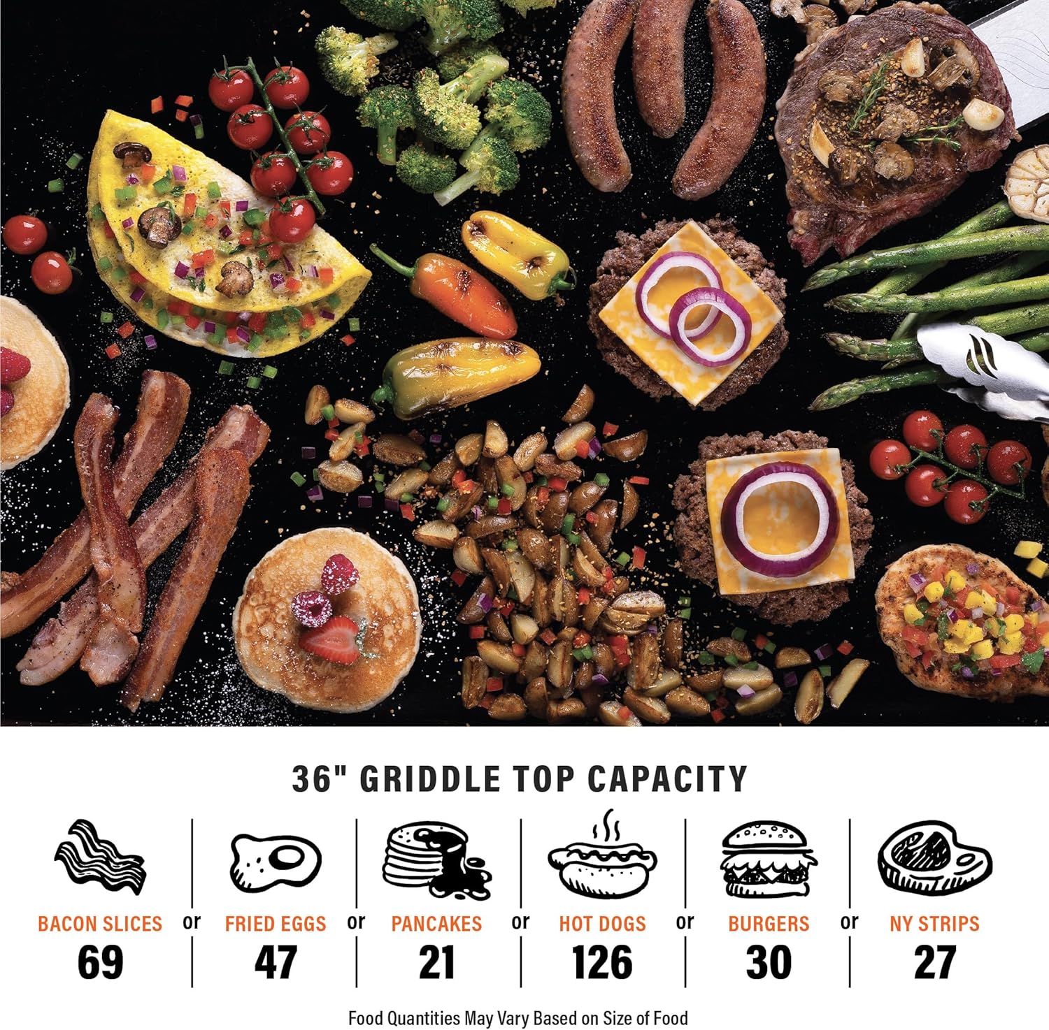 - Cook for a Crowd: Make up to 47 fried eggs, 21 pancakes, 30 burgers, or 27 steaks on this spacious 768 square inch griddle. Invite family and friends over for a delicious outdoor meal and enjoy efficiently cooking for a large gathering