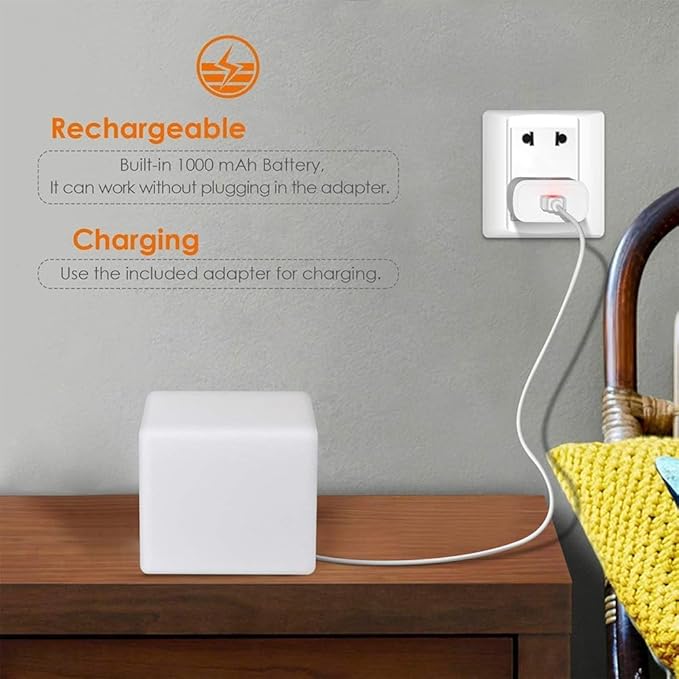 - Cordless, Portable and Waterproof: Powered by built-in Rechargeable Lithium Battery, the small sturdy cube night light stays lit for up to 8 to 48 hours after each full charge - Safe-charge by the included charger adapter