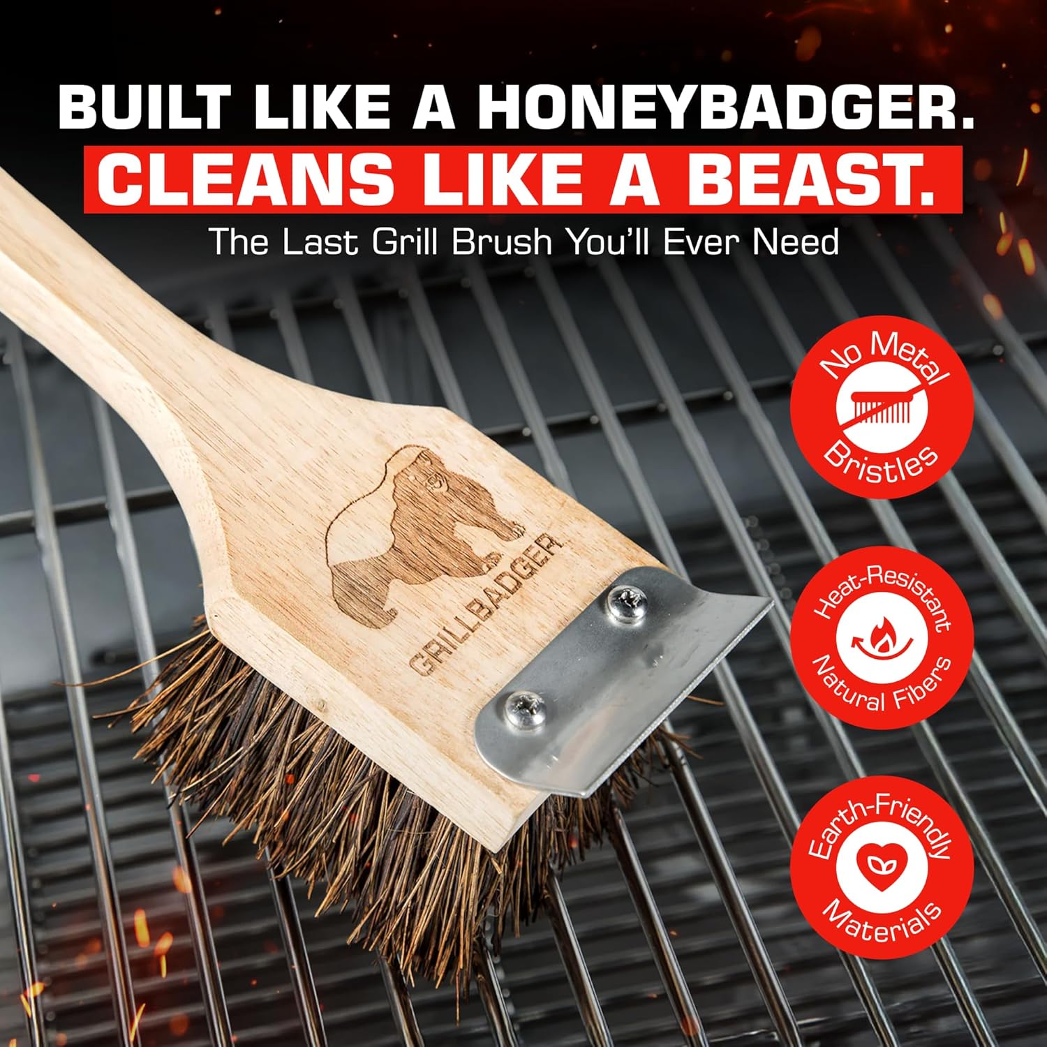 - GRILL BRUSH NON METAL BRISTLES FOR SAFER COOKING: Enjoy peace of mind with GRILLBADGER grill brush non metal bristles, designed to eliminate the danger of metal bristle ingestion. Our wooden grill brush for outdoor grill is a great tool for safety-focused home cooks who value family-safe, sustainable grilling. Keep your cooking space secure with a grill brush without metal bristles that cleans without putting your loved ones at risk.