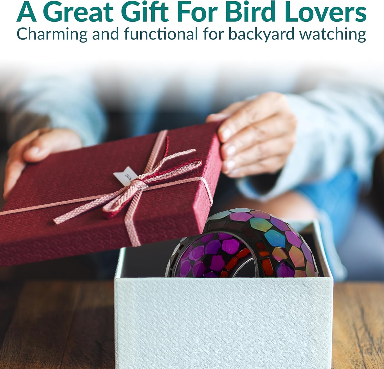 - ATTRACT BIRDS TO THE YARD: This cute bird feeder features vibrant colors and a mosaic glass construction that is sure to appeal to humans and birds alike. The bright colors and reflective material will help attract a variety of bird species to the feeder including cardinals, finches, sparrows, and more. Plus, it will add a stylish pop of color to any patio decor. The open fly-through design also makes it easier for birds to access the seed, encouraging them to come back again and again.