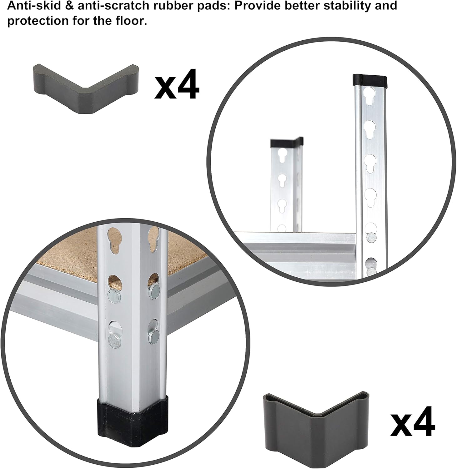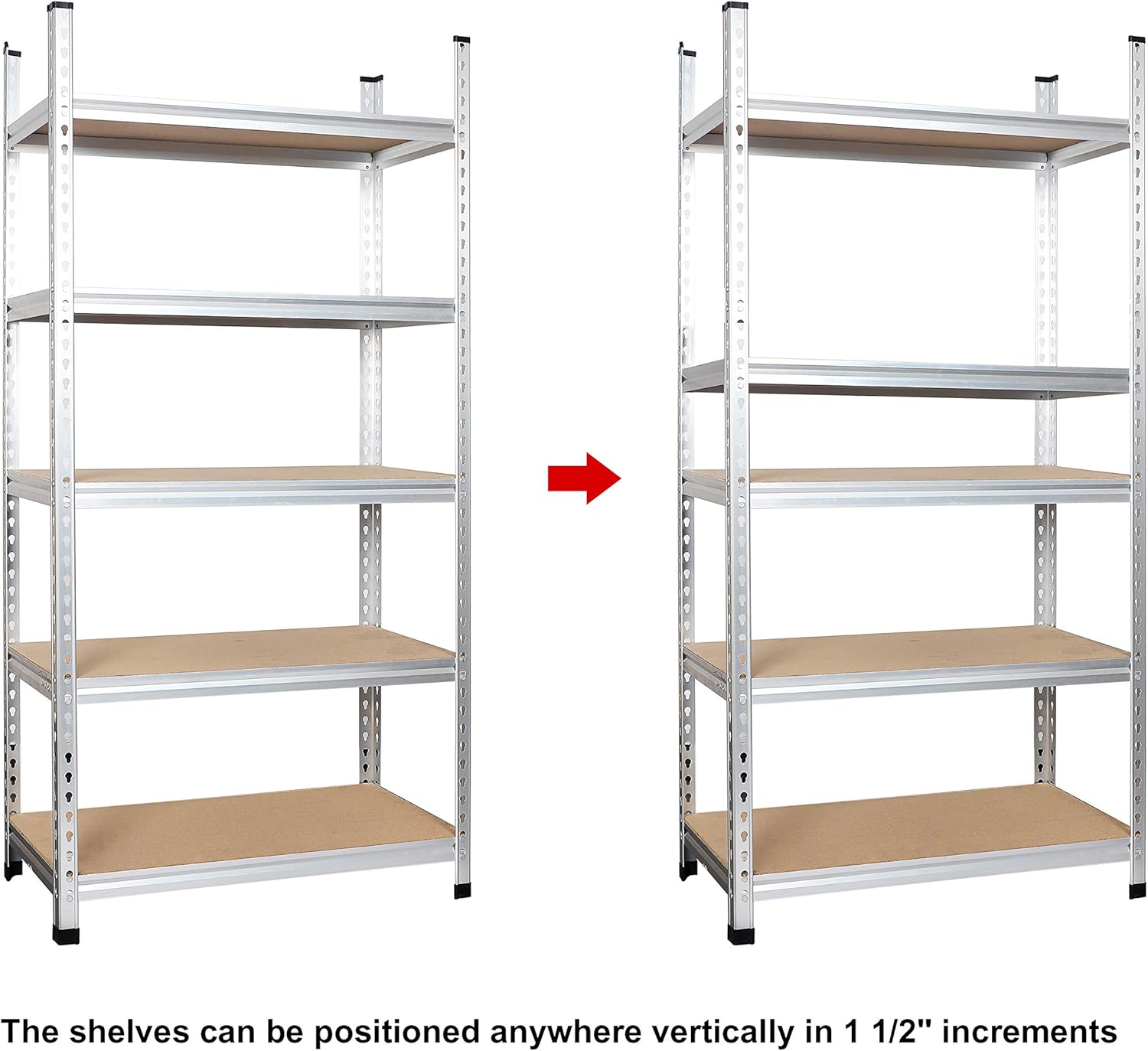 - Durable high-grade aluminum construction with anodizing finish; press-board shelves adjust up or down in 1-1/2-inch increments