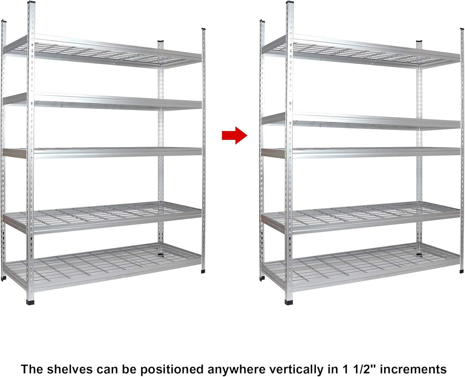 - Storage Unit dimensions (Together) – 24" W x 60" L x 78" H | Storage Unit dimensions (Separated) – 24" W x 60" L x 39" H | Shelves adjustment (Up & Down) – 1.5” increments | One single shelf can hold up to 800 lb, and the whole shelving unit can hold up to 4000 lb (when evenly distributed and on a level surface)