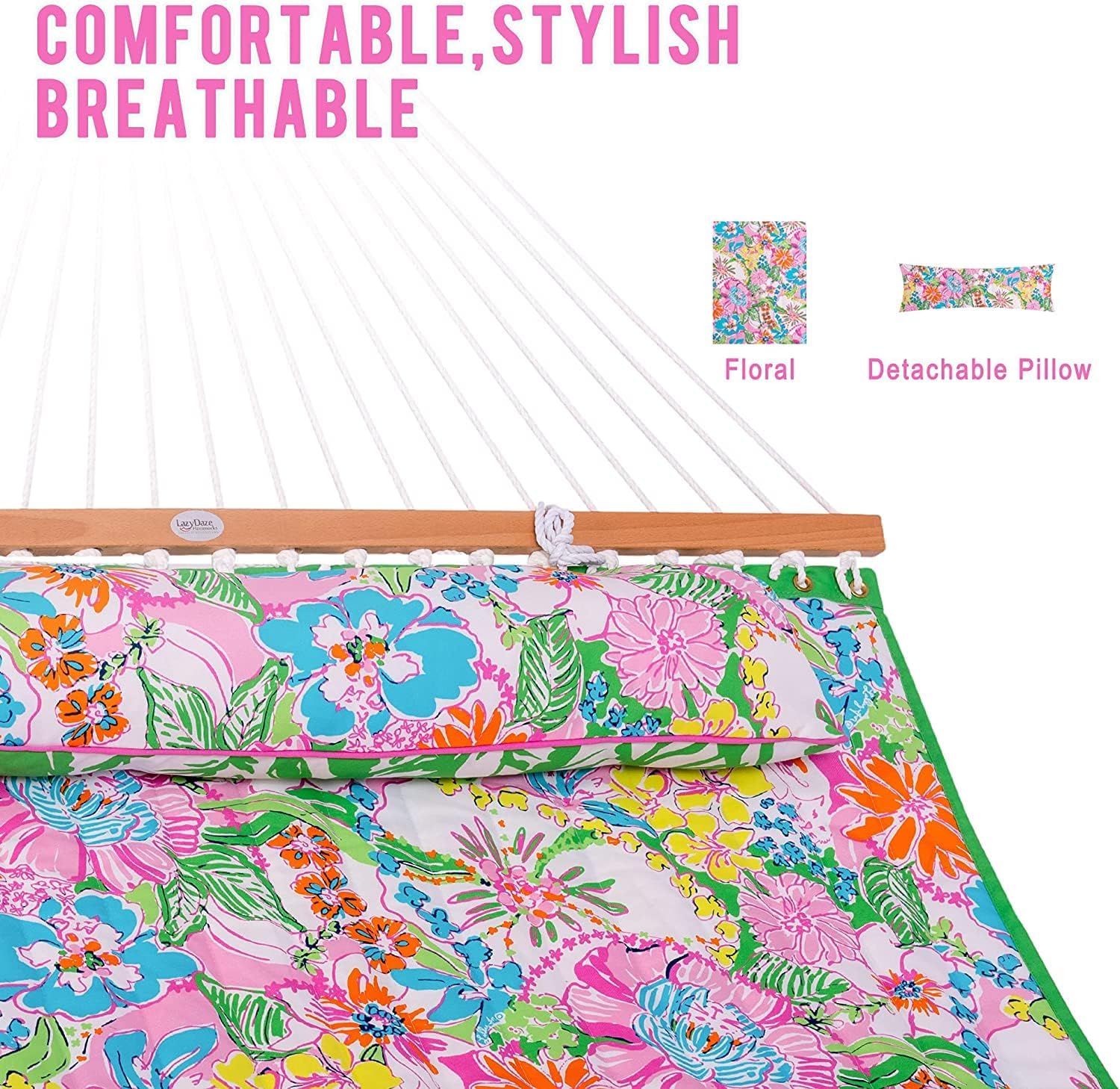 Lazy Daze Hammocks 12 FT Double Layered Quilted Fabric Hammock Swing with Pillow and Carrying Bag, Elegant Tassels and Spread Bar Heavy Duty Stylish for Two Person, Floral