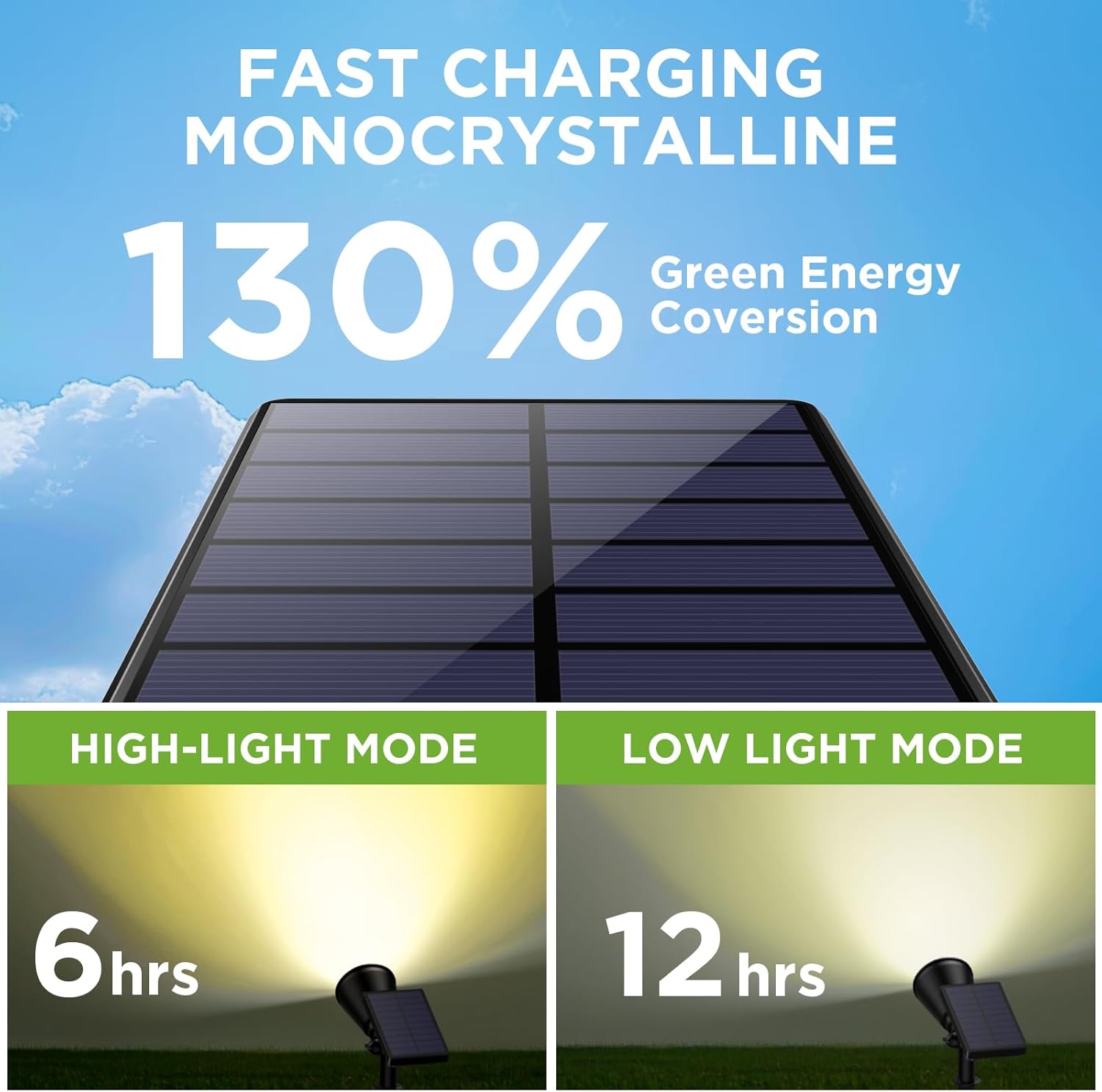 - Improved Brightness & 2 Working Modes: With super brightness, this solar spotlight can cast a focused ray to highlight your flagpole or beautiful sculpture, even on the darkest of nights. You have the option to set from High Mode (MAX 6Hrs) to Low Mode (MAX 12Hrs) to extend working time.