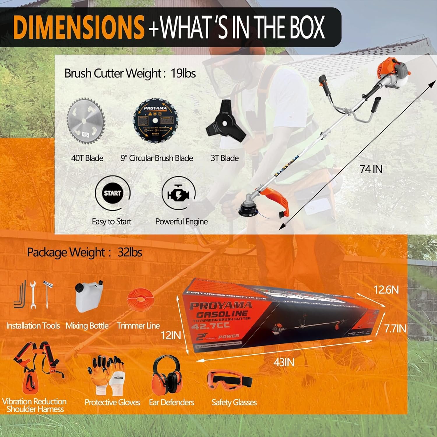 PROYAMA 42.7cc Gas Weed Wacker, 3 in 1 Weed Eater Gas Powered, Brush Cutter and Gas String Trimmer 2-Cycle Extreme Duty, 5 Year Warranty Gearbox, Grass Trimmer 2025 Upgraded…