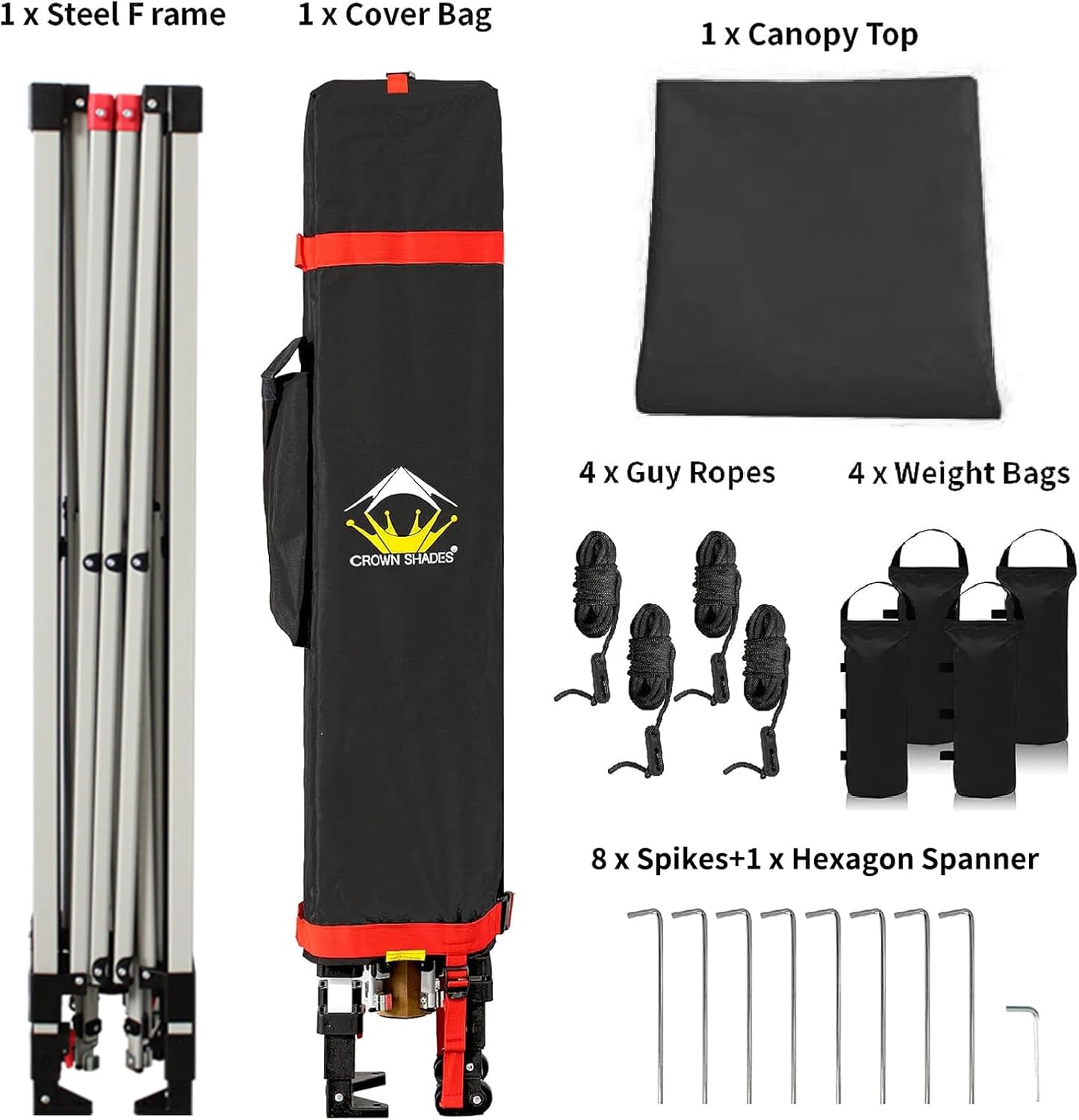 - HIGH GRADE STEEL FRAME - The durable, high-grade, corrosion-resistant steel truss frame with hardened through bolts comes pre-assembled and can be set up without any tools. Engineered to support up to 120 lbs. distributed across the frame, it ensures robust and reliable performance. The extended ceiling assembly and upgraded high peak design make it easier for rainwater to run off, preventing water pooling on the canopy. Perfect for extended outdoor use at markets, festivals, and exhibitions
