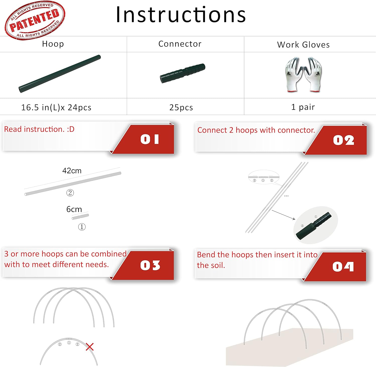- DIY Kit Includes - Comes with 24pcs hoops frame, 1/2" in diameter, 17inches in length; 25pcs connectors; 1 pair of work gloves.