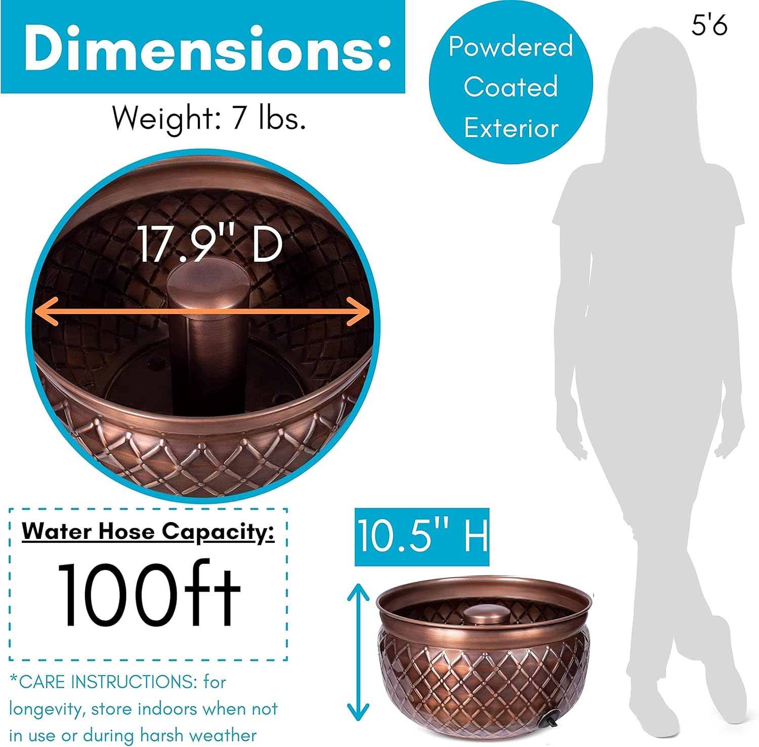 BIRDROCK HOME Water Hose Holder - Decorative Metal Pot, Indoor or Outdoor, Garden Storage Organizer, Patio Portable Bucket - Embossed Steel w/ Copper Accents, Holds up to 100ft Hoses