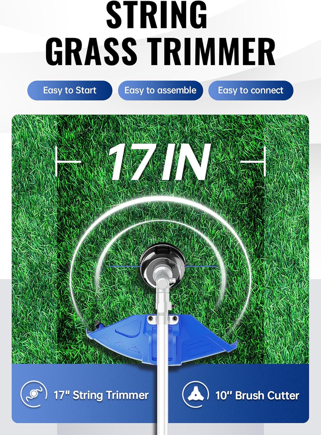 - 3 in 1 Multi-function: 17" String Trimmer/Edger and 10" Brush Cutter included, blade diameter: 10 inches.