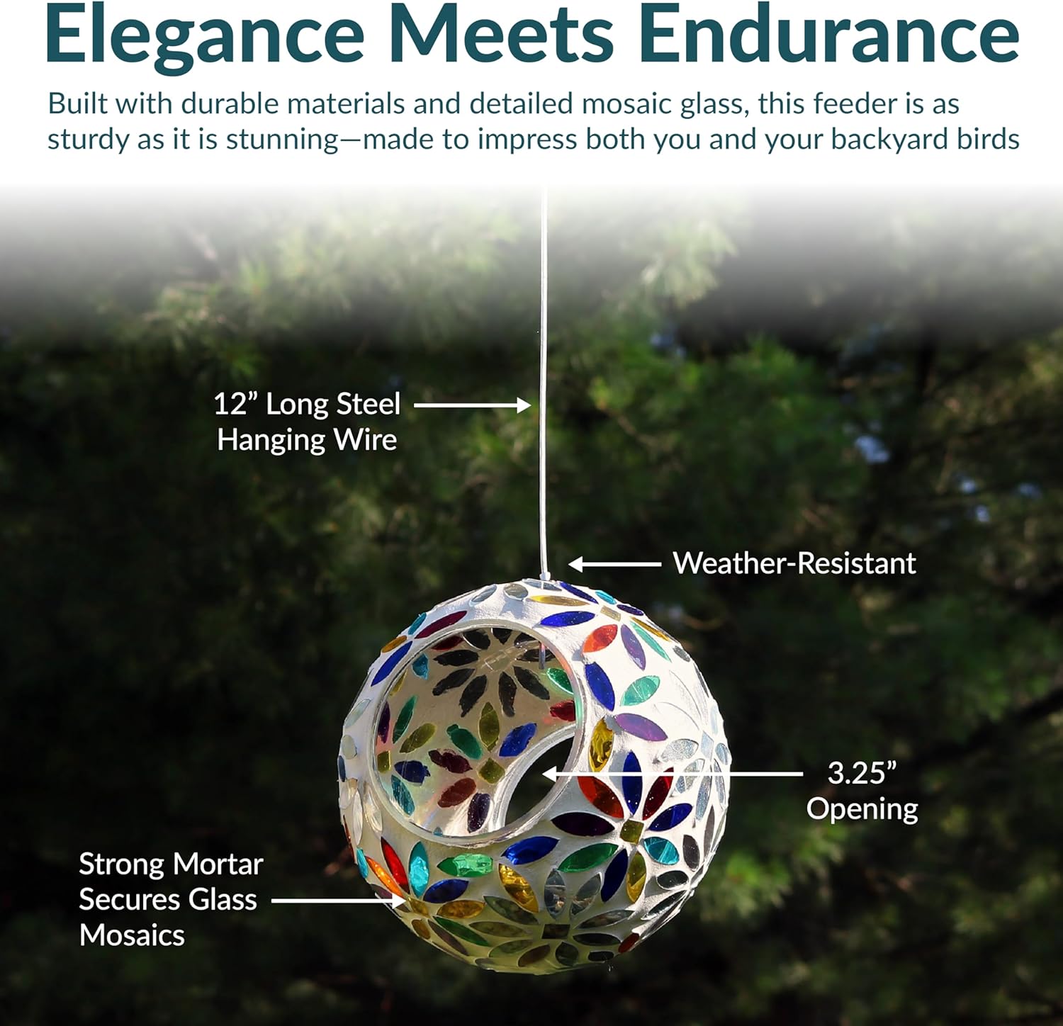 - ATTRACT BIRDS TO THE YARD: This cute bird feeder features vibrant colors and a mosaic glass construction that is sure to appeal to humans and birds alike. The bright colors and reflective material will help attract a variety of bird species to the feeder including cardinals, finches, sparrows, and more. Plus, it will add a stylish pop of color to any patio decor. The open fly-through design also makes it easier for birds to access the seed, encouraging them to come back again and again.