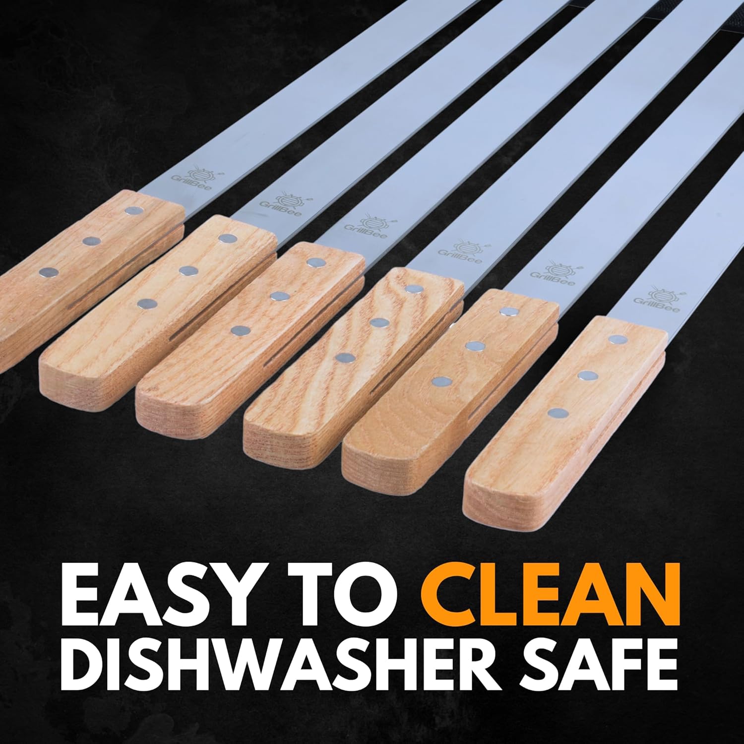 - Wooden Handle Design. The wooden handle protects your hands from the heat that travels throughout the length of the metal skewer and keeps the handle cool and easy to work with. Its Easy to Clean Skewers and they are Dishwasher safe.