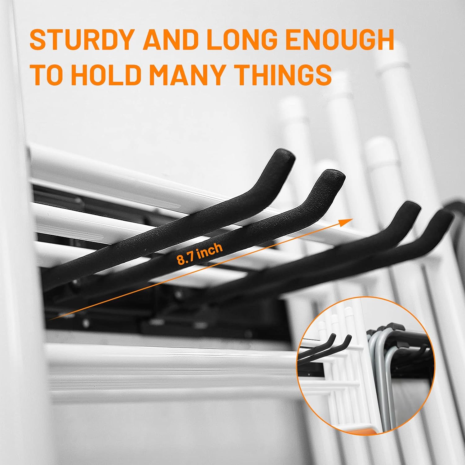 - ADJUSTABLE STORAGE SOLUTION— The best part of the garage storage system is that the hooks can snap on the rail and move around on it to meet your actual needs