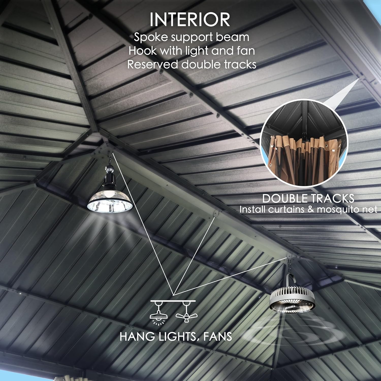 - ✅Metal Canopy/Roof and Gutter Design - The metal canopy of this gazebo ensures longevity and durability. Its roof, made of sheet metal, boasts a robust 29-gauge thickness, which is thicker than most gazebos on the market. its water gutter system ensures that rainwater is efficiently directed away from the edges of the frame and poles.