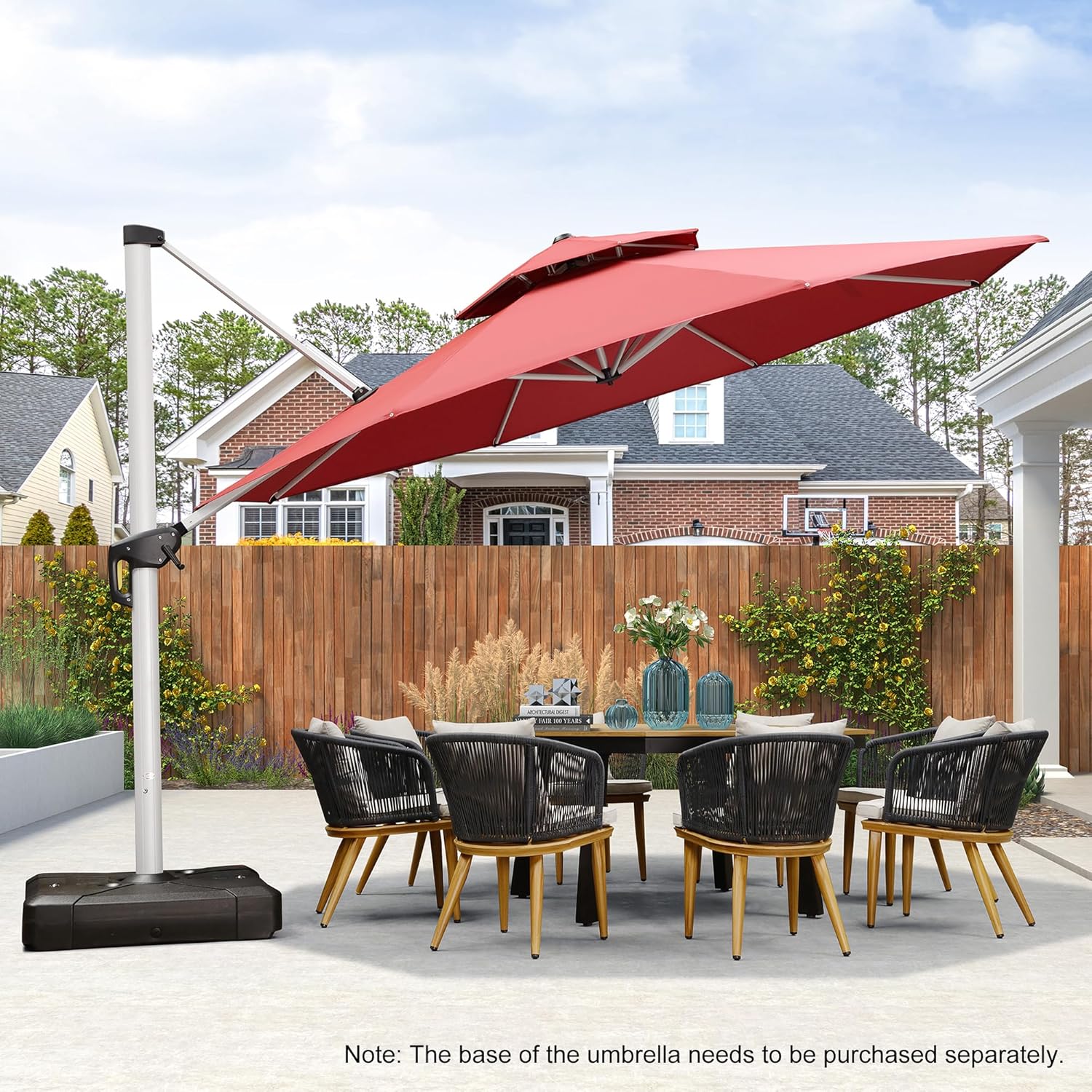 - Patio umbrella base in the picture is NOT included. Please search PURPLE LEAF DY1150 for water tank base, PURPLE LEAF anchor ground base or steel plate base. Please see the recommended base on the details page.