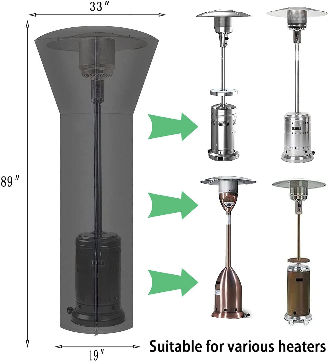 - 【Product Size】- 89 "H*33 "DIA(Dome)*19DIA1(Base) fits most outdoor patio heaters, but please confirm the size of your patio heater before placing your order.
