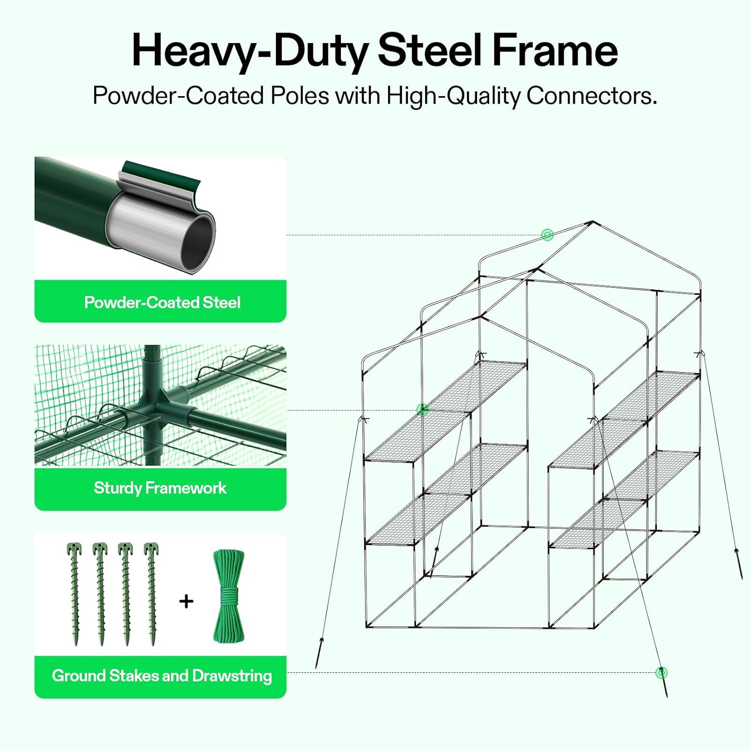 - Sturdy & Durable Framework: Supported by a powder-coated heavy-duty steel frame, the walk-in green house is very sturdy and firm; An additional 4 ropes and stakes can help you strengthen its stability and safety