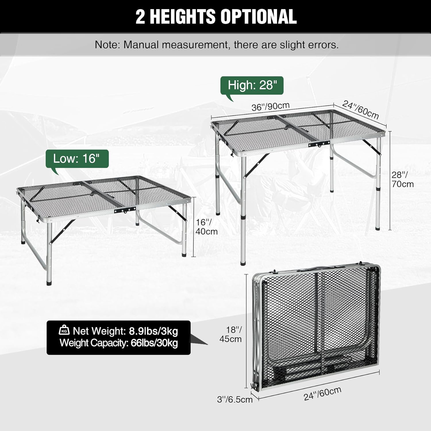 - 2 Adjustable Heights: RedSwing Aluminum Folding Grill Table is 36"x24"/91cmx60cm, height is 15"/38cm in low, 28"/71cm in high. Pack size is 24"x3"x18"/60cmx 7cmx45cm when folded.