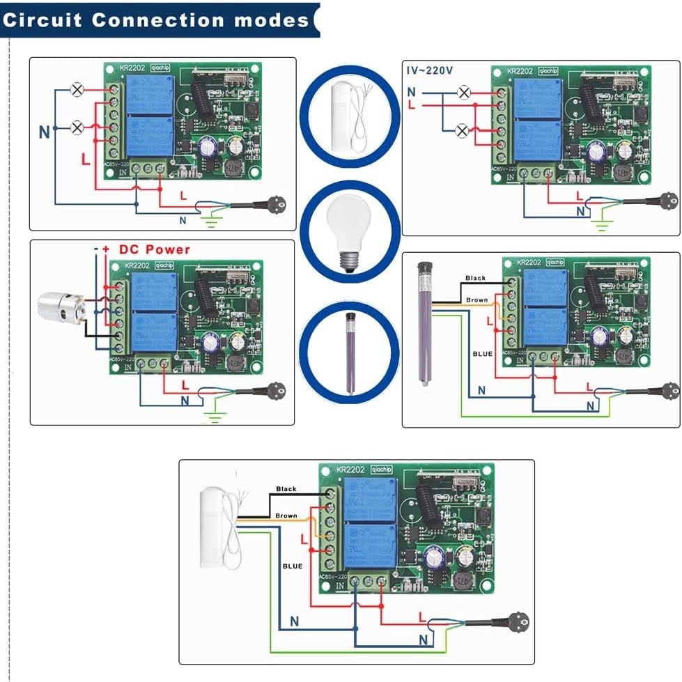QIACHIP 110V 120V 220V Wireless RF Remote Control Relay Switch Universal 2-Channel 433MHz Receiver with 4 pcs Transmitters for Garage Door Openers, Cars, LED Lights & More (KR2202)