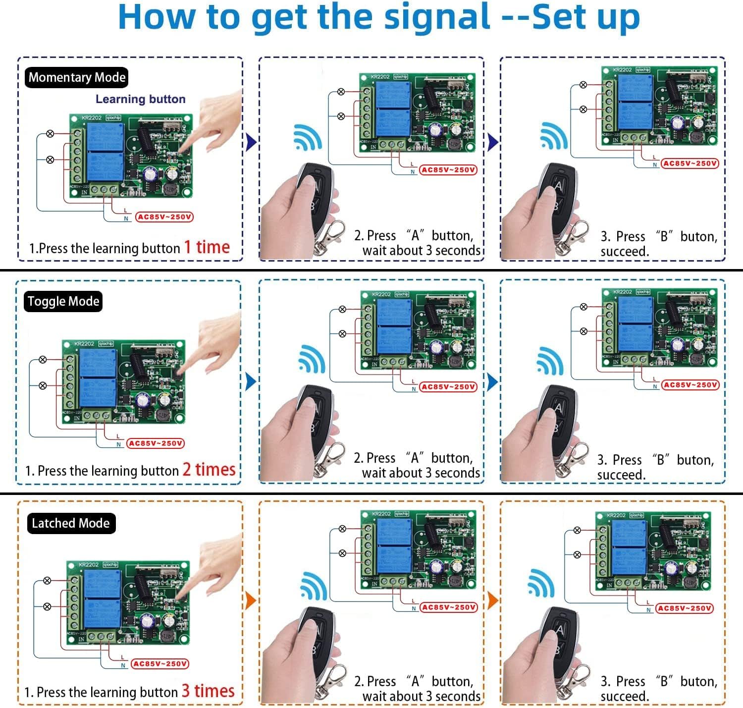 - 2CH Channel Wireless Remote Control , Adjustable working way, on/off. Switch Momentary/Toggle/Latched.