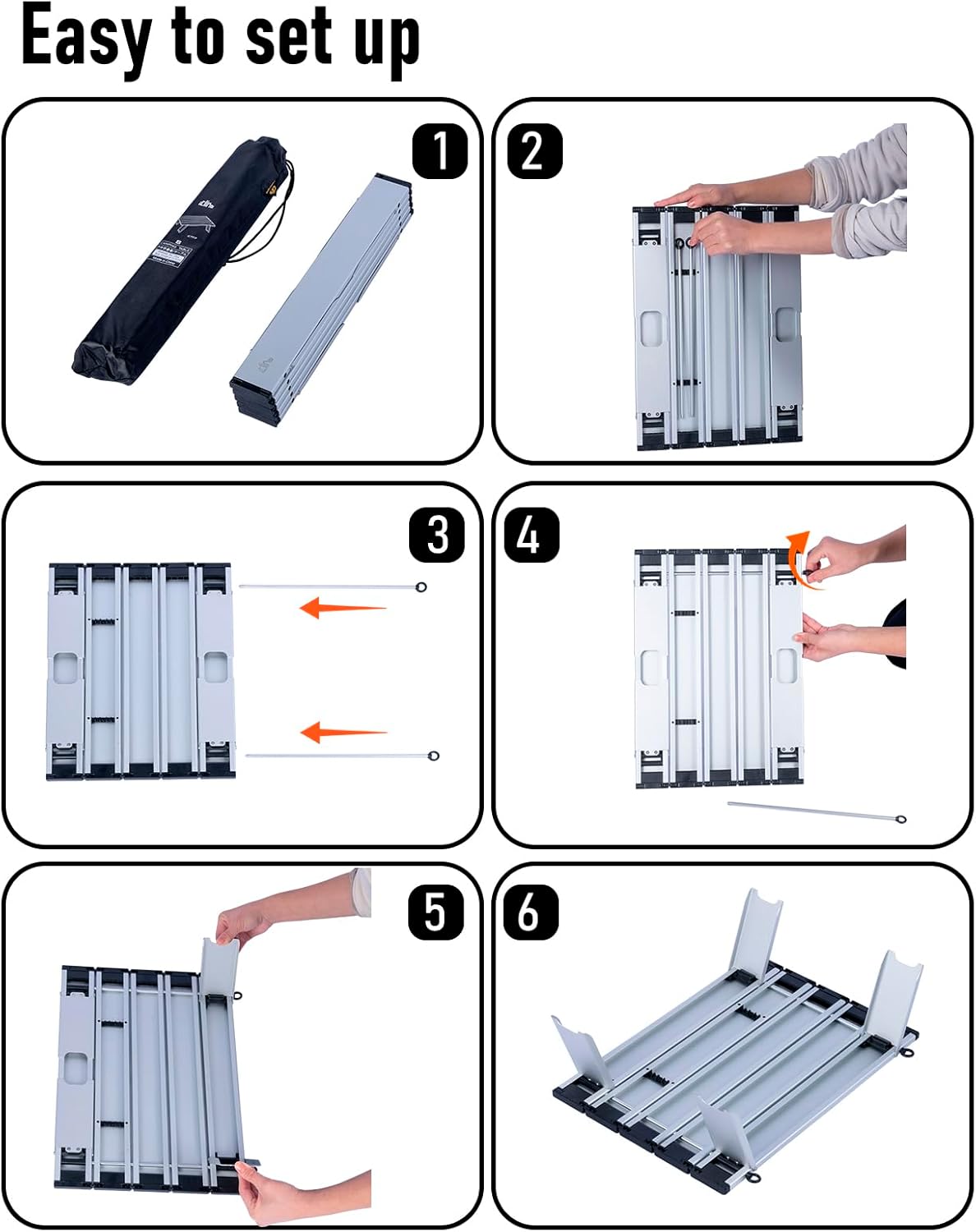 - Ultralight, made of high quality aluminum alloy 6063, only 1.5 lbs; Max Load 66 lbs; Unlike wooden or nylon-top tables, this table is durable, waterproof, corrosion-resistant, easy to clean; Heat resistant, can put your stove on