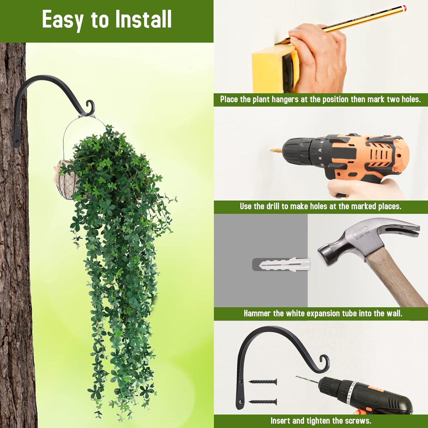 - 【PREMIUM QUALITY】 The hanging basket hook is made of heavy-strength steel, which is durable and rust-proof. The straight board fixation provides high load-bearing capacity and high stability and the forged screw can bear more weight without deformation.