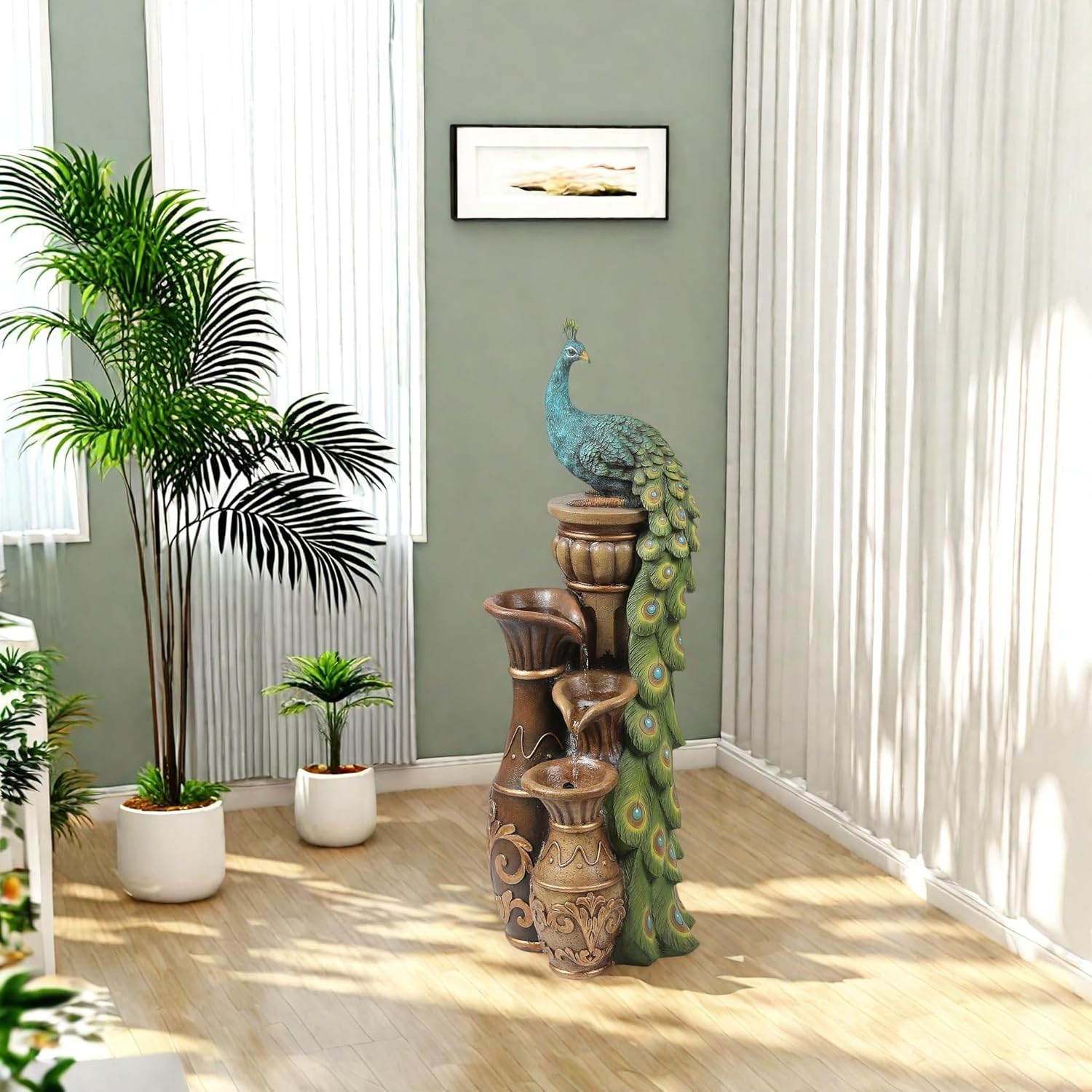 LuxenHome Outdoor Water Fountain, 44 Inch Resin Peacock Water Fountain Outdoor with Urns and LED Light, Tall Fountains Outdoor for Garden, Waterfall for Patio, Brown/Teal