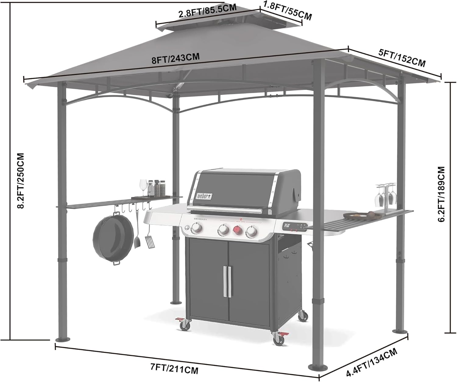 - ✅Grill Gazebo Size: L 96.1 x W 59.8 x H 96.5 in. Package includes 1 Steel Frame + 1 Grill Gazebo Top.