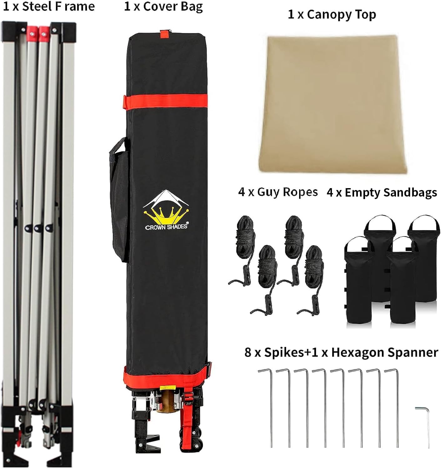 CROWN SHADES 10x10 Pop Up Canopy, Patented Center Lock One Push Tent Canopy, Newly Designed Storage Bag, 8 Stakes, 4 Ropes, Beige