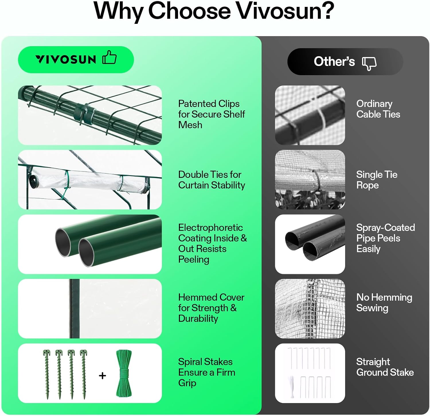 - Easy Installation & Storage: All accessories are included: with step-by-step instructions, an adult can easily set up our Vivosun greenhouse without any other tools necessary; As the seasons change, it can easily be deconstructed either for storage or transportation