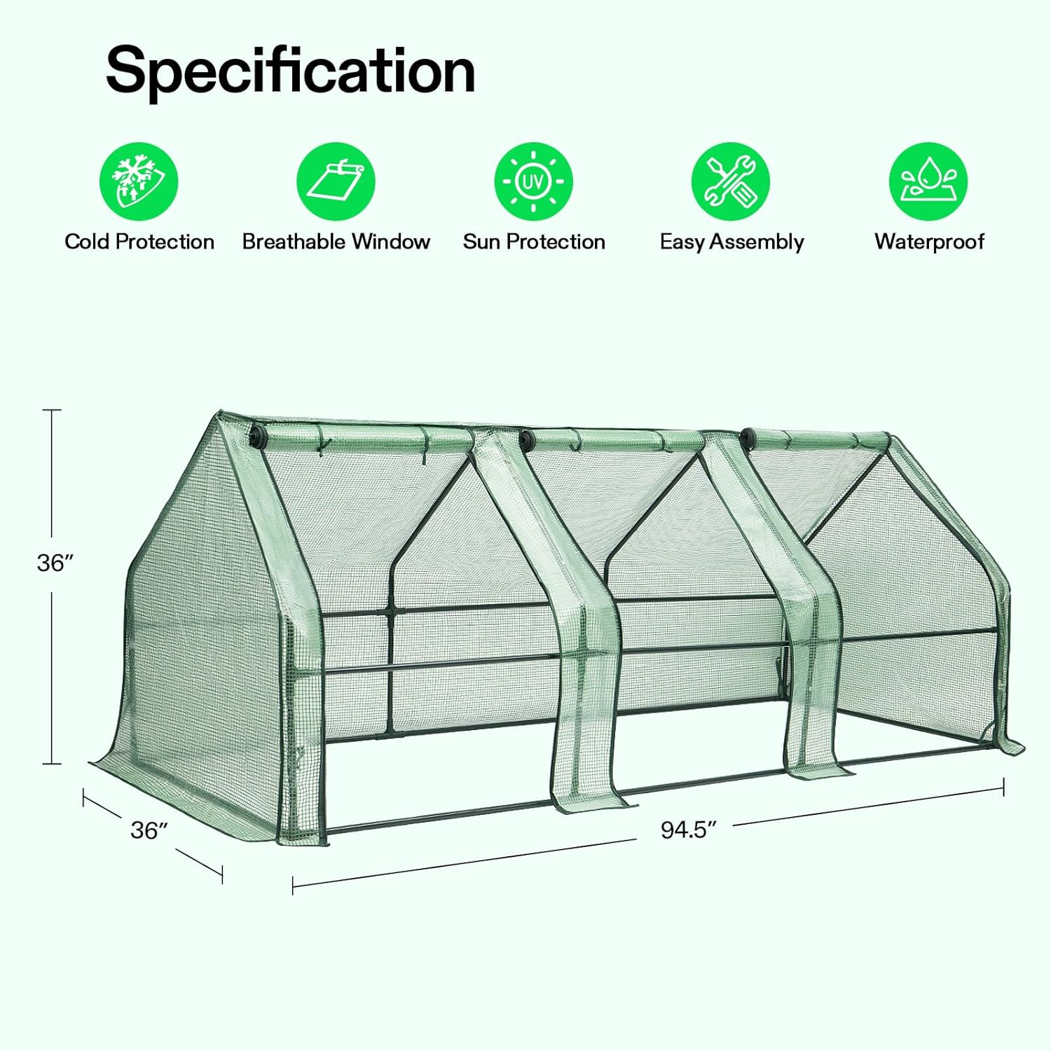 - Long Tunneled Green House: 94.5 x 36 x 36-Inches.It Can be used for the production of fruits, vegetables, flowers, and any other plants that require special temperature or other planting conditions