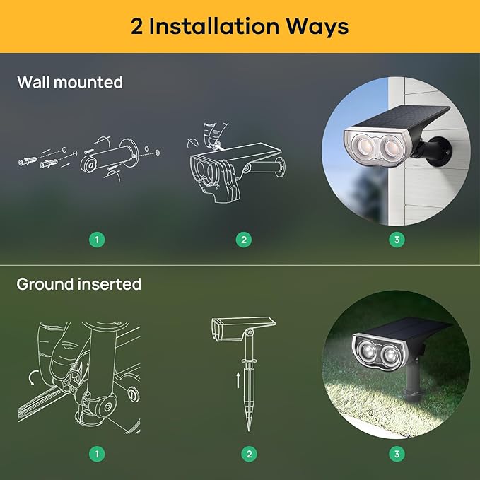 - ☆TWO-WAY MOUNTING- With specially designed ground stake and wall bracket, you can either stick the spotlight into the ground as solar landscape light or fix it on the wall as wall light. Be creative to arrange the position which you want to be. Perfect for patio, porch, deck, pool, yard, garden, garage, driveway, pathway, etc.