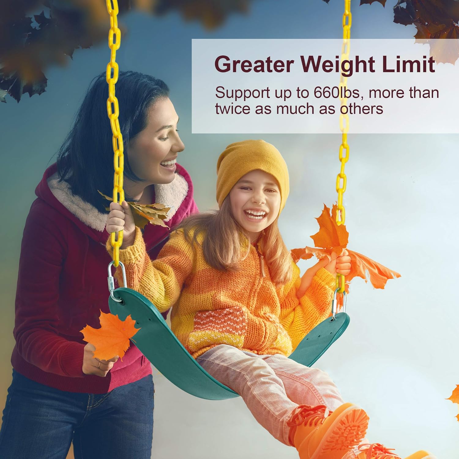 - 【Thickened Soft & Safe Swing Seat】Made of EVA plastic material, our swing seat is soft & strong to let you feel comfortable. It extrudes without deformation and has chemical resistance, corrosion resistance & crack resistance.The thickened swing board is 26 x5.5 inch of U shape. Sitting on it you will wobble more safely and have more fun. The swing set owns safe non-slip designs & lovely color that won't hurt your eyes. It is easy to clean, suitable for girls & boys in outside activities.