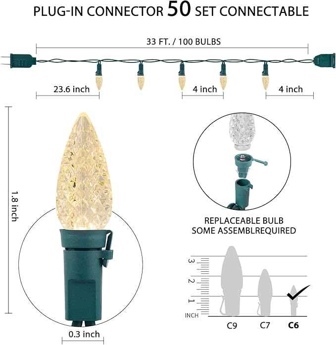 - 【 Connectable Up to 50 Sets 】- You can connect up to 50 sets of these C6 LED Christmas string lights end to end, which is incredibly convenient for decorating broad areas or a sizeable outdoor object - such as your roofline, railings, or an oversized tree