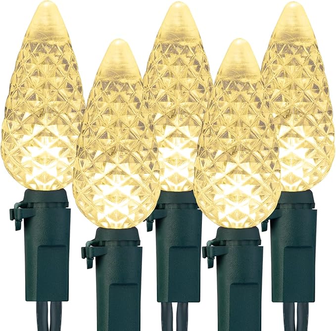- 【 Super Bright Glow 】- These Christmas light strings feature classic, faceted C6 bulbs made from durable polycarbonate, offering good brightness, colour saturation, ruggedness and reliability. Built-in SMD LED creates vivid lighting effects; the diamond facet hole design prevents stagnant water. Bulbs with vibrant colours will never fade, chip or crack