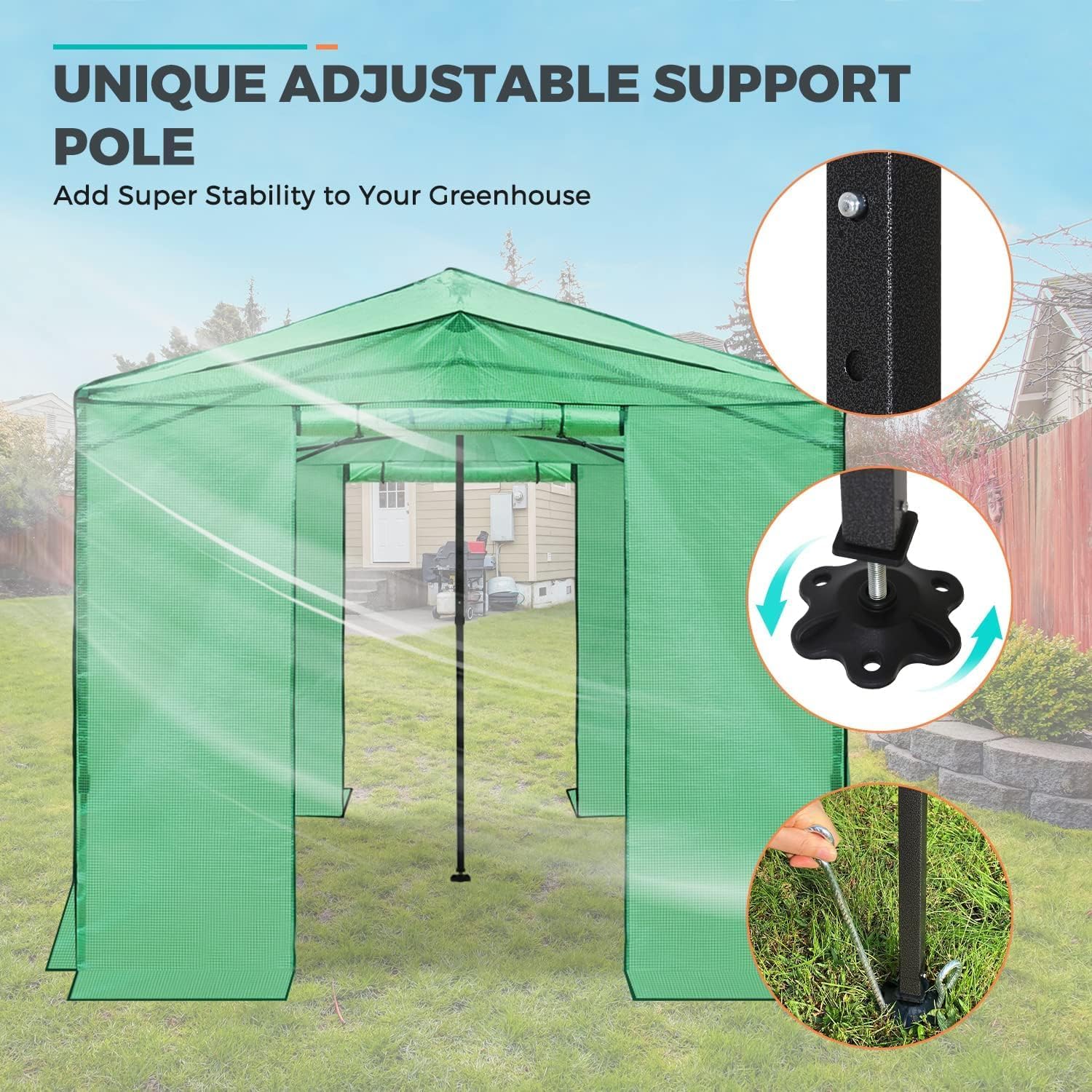 - BUILT FOR ALL SEASONS: The heavy-duty steel frame provides durability and stability, giving you peace of mind even in challenging outdoor conditions. Comes with a unique adjustable support pole to add super stability to the greenhouse, reinforced with wind ropes and stakes, it is the ultimate solution for long lasting use even in tough weather. Set it up in your backyard, patio, garden, or even indoors