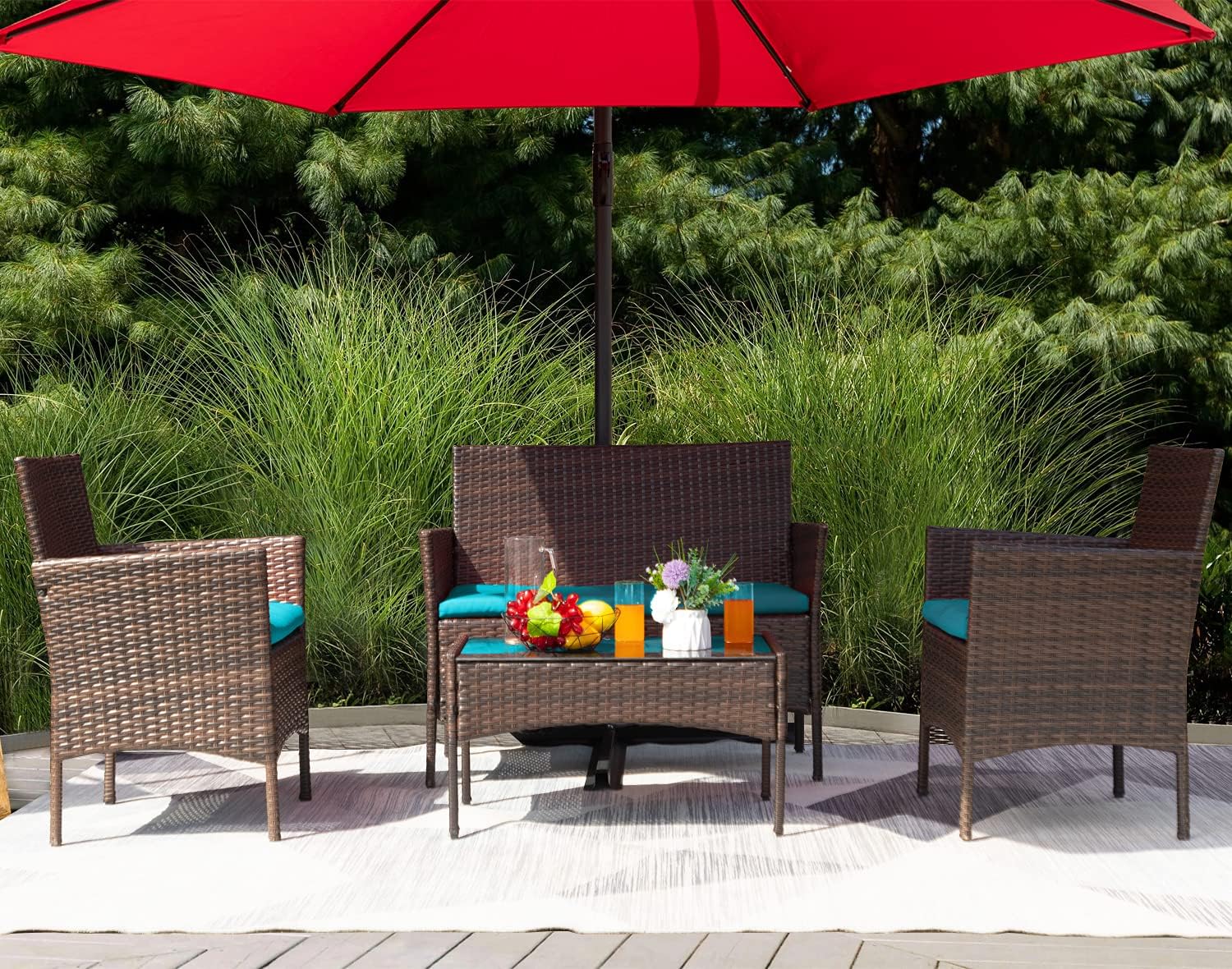 Greesum Patio Furniture 4 Pieces Conversation Sets Outdoor Wicker Rattan Chairs Garden Backyard Balcony Porch Poolside loveseat with Soft Cushion and Glass Table, Brown and Blue