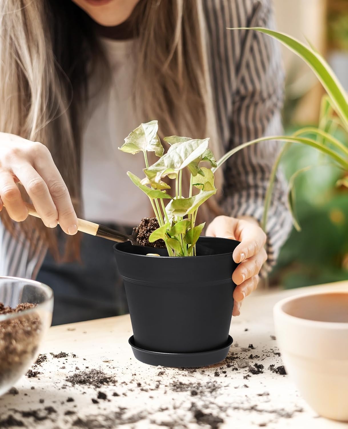 homenote Pots for Plants, 8 Pcs 7.5 Inch Plastic Planters with Multiple Drainage Holes and Tray - Plant Pots for All Home Garden Flowers Succulents, Matte Black