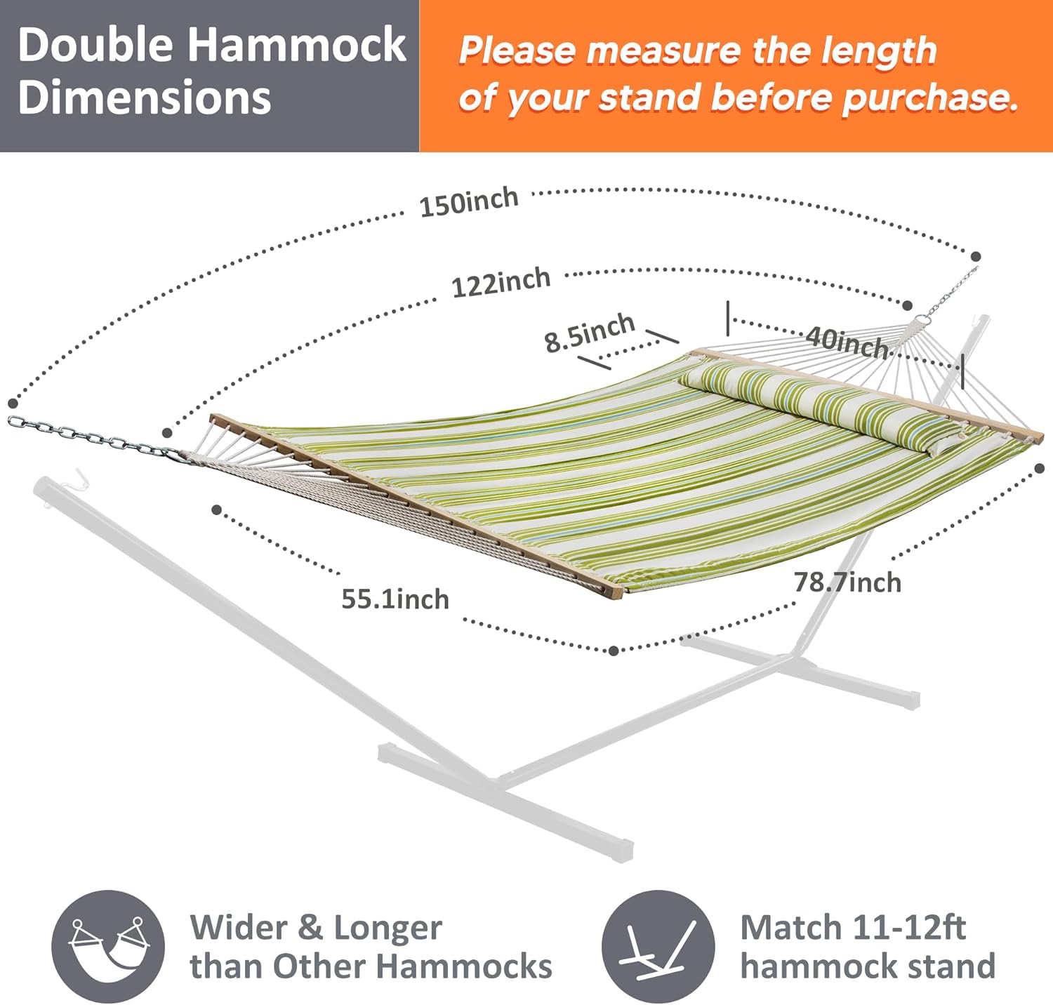 - Two Person Hammock: The hammock bed's dimension is 78.7" L * 55.1" W, the length from ring to ring is 122", larger than other quilted hammocks; The heavy duty hammock is made for sharing. Designed to support up to 475 lbs, you can enjoy a relaxing swing on the hammock with your family, friends, and significant others