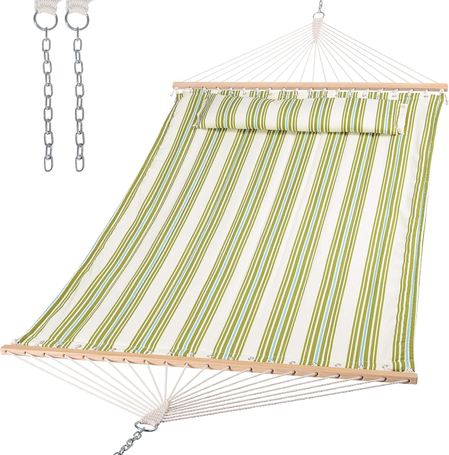 - Comfortable and Non-fading: Two-layer quilted polyester fabric with poly fiber filling which is cozier, best for camping and outdoor activities. Compared to other quilted hammocks, it will not fade after long-term usage. A polyethylene-stuffed head pillow offers superior comfort