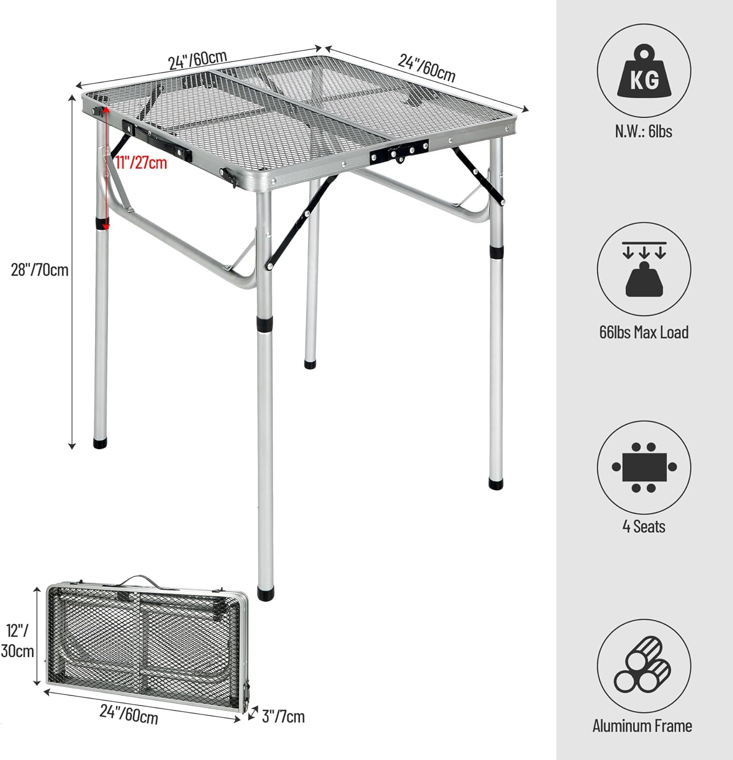 REDCAMP 24" Square Folding Grill Table for Outside, Lightweight Portable Metal Aluminum Outdoor Grill Table with Adjustable Height Legs, Great for Camping Picnic Cooking BBQ, Silver 2ft