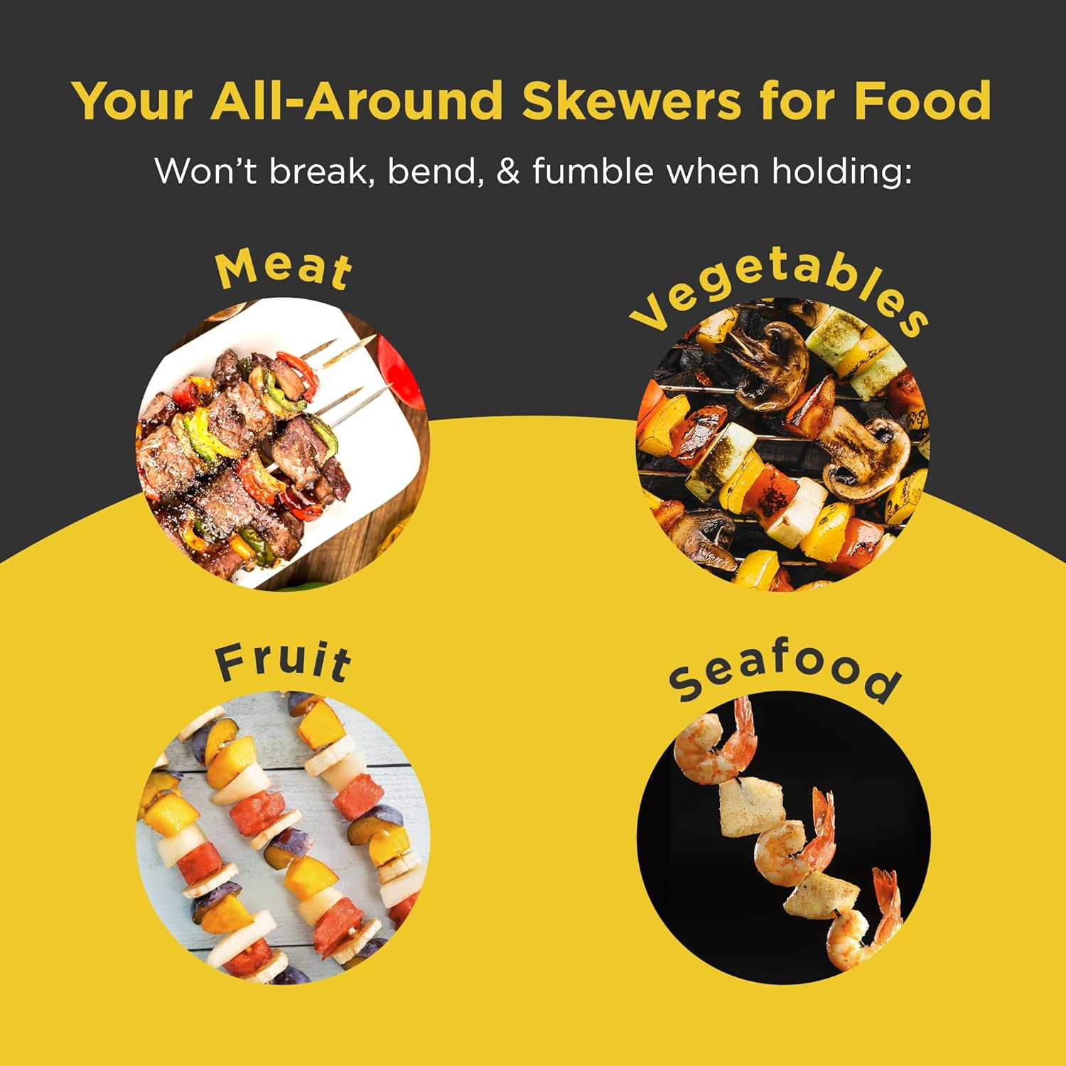 - FLAT METAL DESIGN FOR EVEN COOKING: Our flat barbecue skewers prevent food from rotating during grilling, ensuring each ingredient is evenly cooked. The angled sharp tip easily pierces through a variety of foods, including chicken, beef, seafood, and fruits, providing a smooth grilling process.