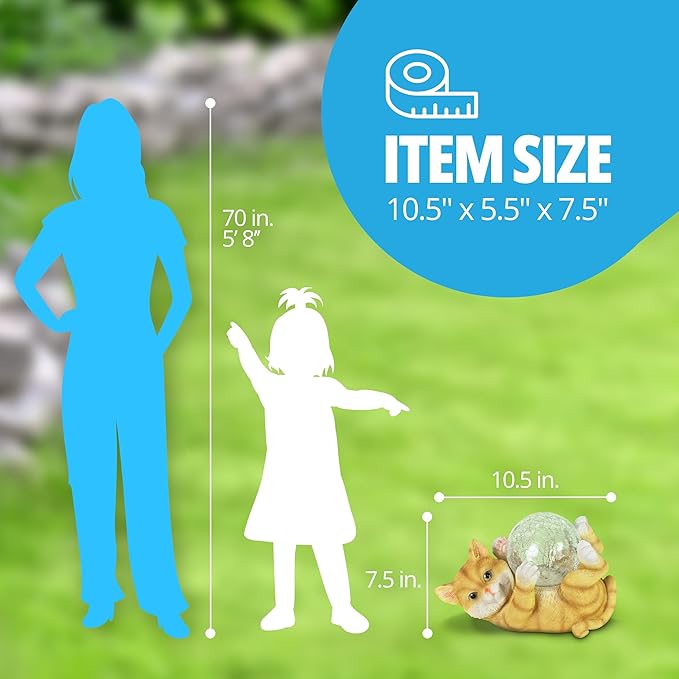 - SOLAR PET CAT GARDEN STATUARY: Add a touch of cuteness to your garden decor with the Exhart solar cat garden sculpture with LED crackle ball. Constructed with durable resin and meticulously hand painted, this playful and adorable orange cat statue is a great way to bring out a warm smile and laughter from your guests and as a way to add charming and whimsical decorations to your garden, front porch, patio, lawn or yard area