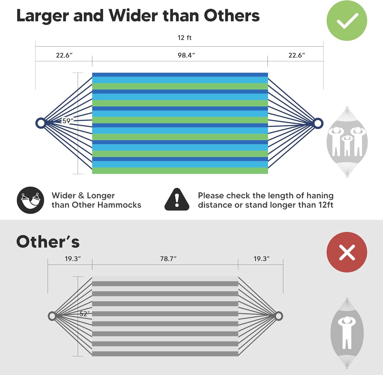 - Larger Bearing Capacity: The heavy duty hammock's total length (from loop to loop) is 144 Inches while the bed size is 98”long X 59”wide, making it perfect for couples
