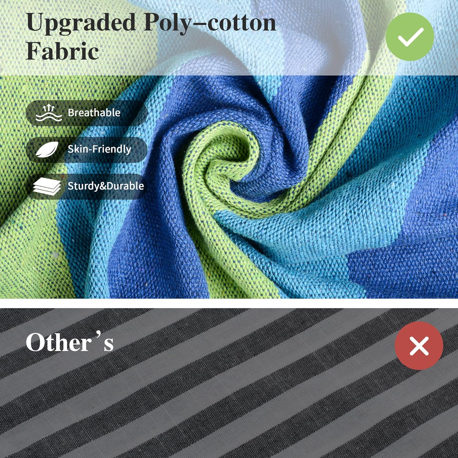 - Upgraded Fabric: Our Brazilian Camping hammock is made of eco-friendly thicker version poly-cotton fabric (no lint, no odor, not pilling, not fading, skin-friendly, and breathable), stronger and much more durable than ordinary fabric hammocks. A comfortable cocoon style hammock can keep you safe while enjoying the peaceful leisure time
