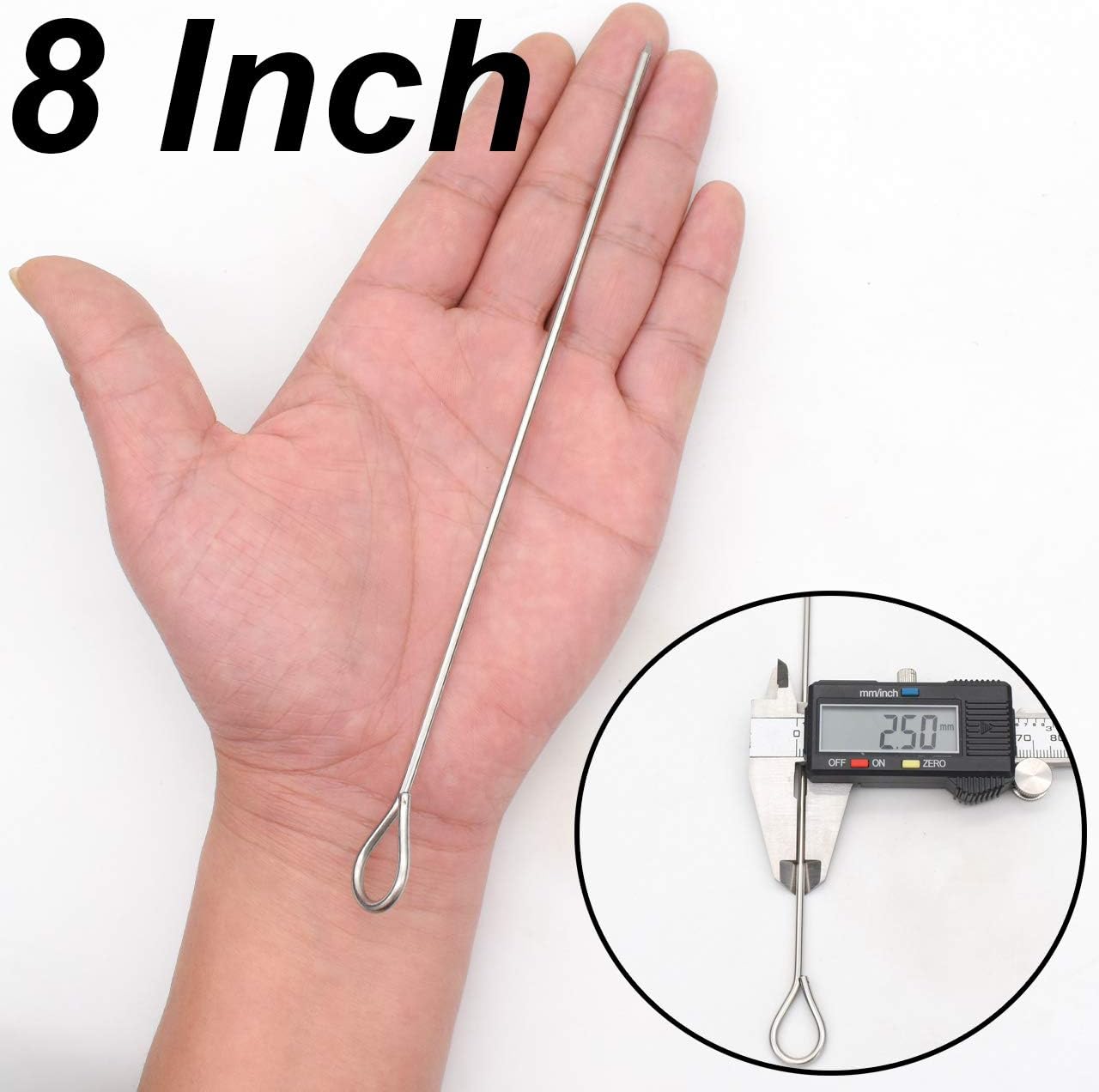 - Each stainless steel kebab/kabob skewer measures (20cm)8 inches long and comes in a pack of 30. Just enough to keep your barbecue and outdoor picnic grilling for everyone to get some chicken, shrimp, beef, peppers, and all other meats