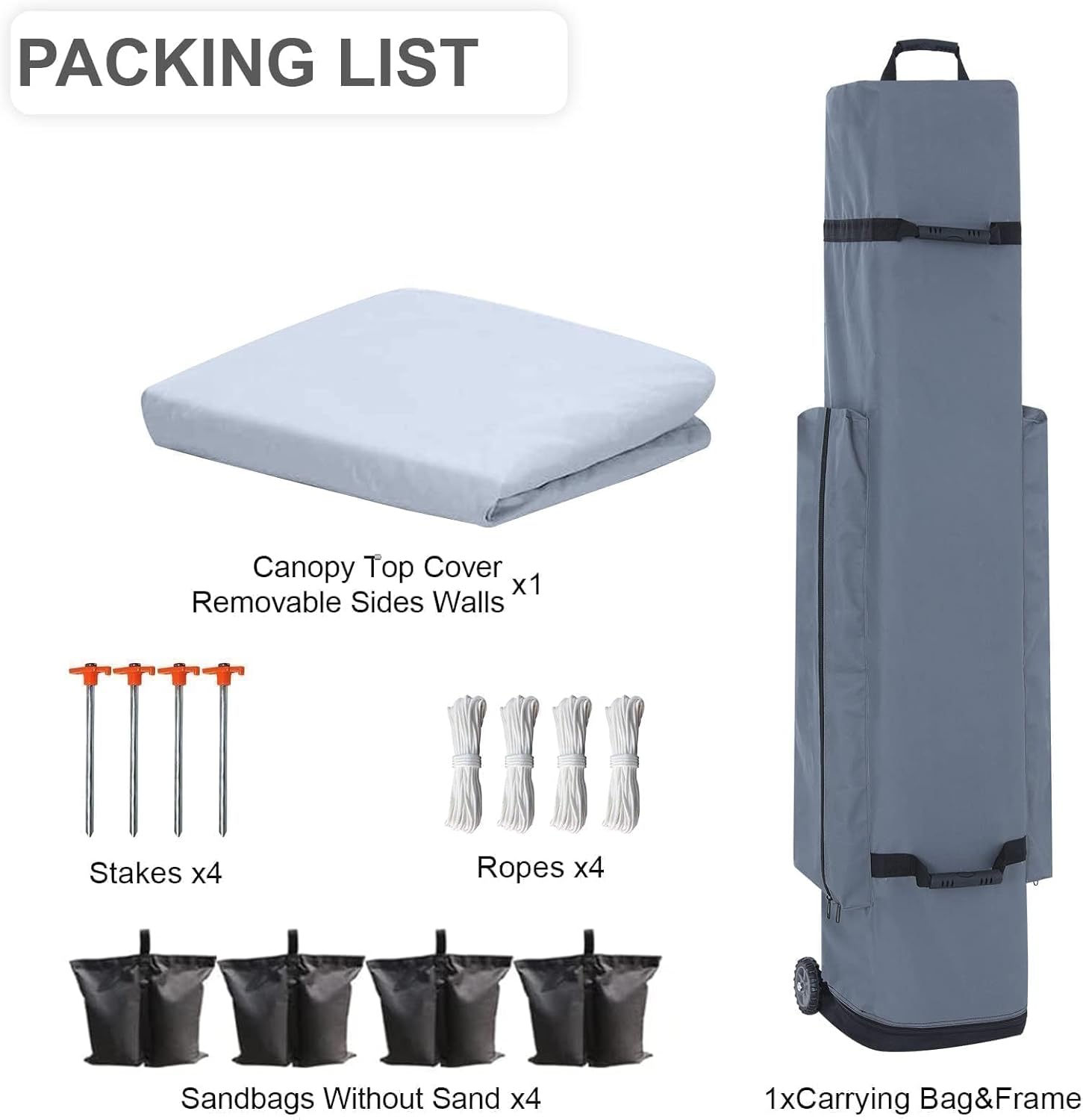 - 👍Packing List:1 10x10 Pop Up Canopy Top Cover and Canopy Frame + 3 Removable Side Walls(10ft) + 2 Door Walls(5ft.) + 1 Carrying Bag + 4 Sand Bags without sand + 4 stakes and ropes.