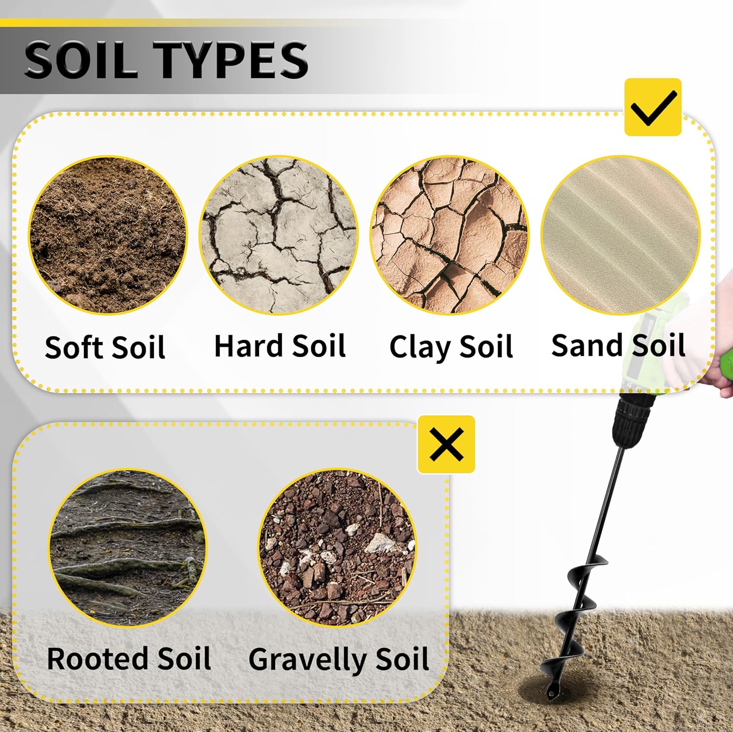 - 【Applicable Soil】Our auger drill bit for planting is ideal for use in sandy, loamy, and clay soils that are relatively soft. It excels in these types of soil, ensuring efficient and precise drilling. However, it is not recommended for soils with many rocks or dense root systems, as these can hinder its performance.