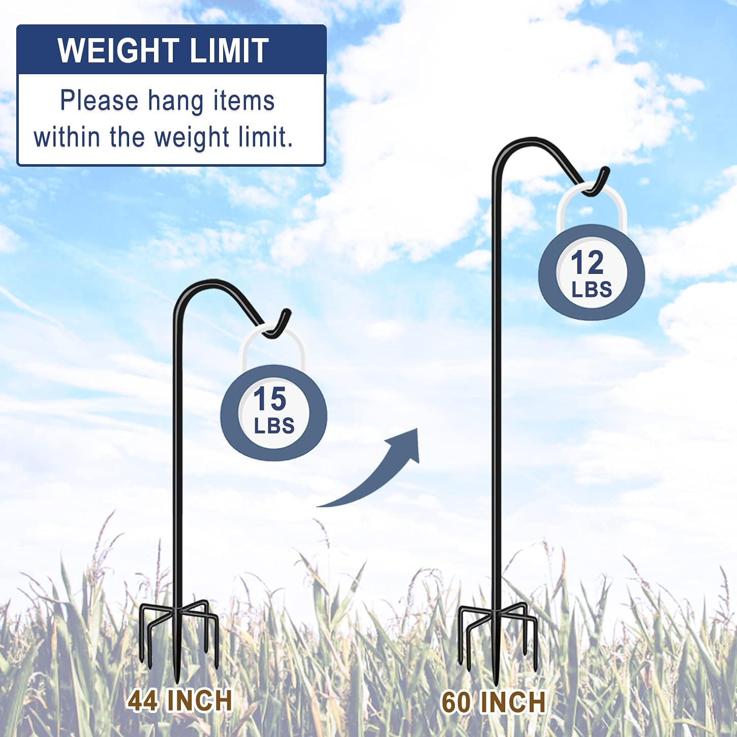 - ADJUSTABLE DESIGN & EASY TO ASSEMBLE: Eazielife outside garden plant hook has 4 different height options (base included): 44"- 60". Moreover, the installation is simple. This pole comes in sections, and each part fixes upon the other only by rotating several turns in a clockwise direction.