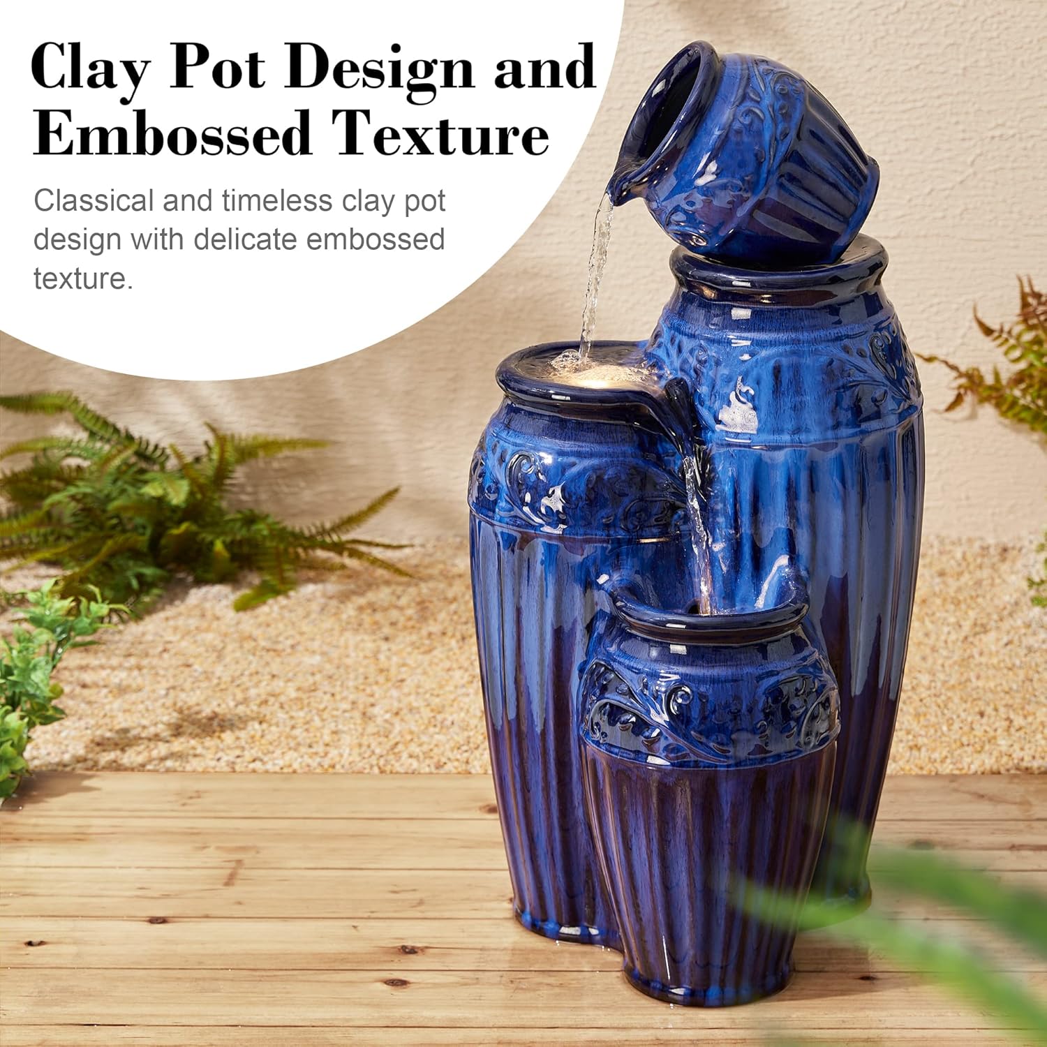 - Elegant 4-Tier Classic Design --- Featuring a classic, clay pot silhouette adorned with delicate embossed textures, this Ceramic Cobalt Blue Fountain exudes vintage charm. The striking kiln-fired cobalt blue glaze adds an elegant touch, while warm white LED lights in the two lower pots create a magical ambiance.