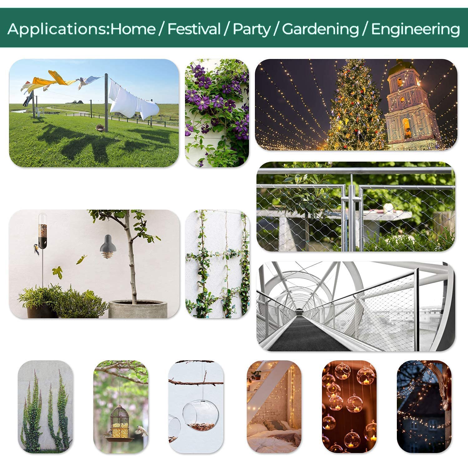 - 【Multi Application】:Suitable for outdoor applications such as tent ropes, clotheslines, outdoor hanging lights, deck cable railings, picture displays, etc. It can also support climbing plants, garden railings, canopies, pergola, etc.